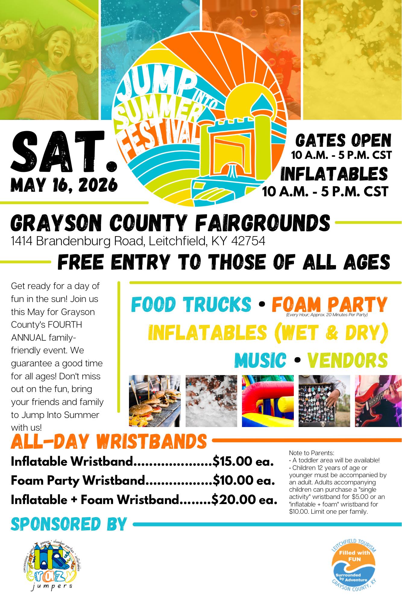 Get ready for a day of fun in the sun at the 4th Annual Jump Into Summer Festival! This family-friendly festival will take place at the Grayson County Fairgrounds on Saturday, May 16, 2026.